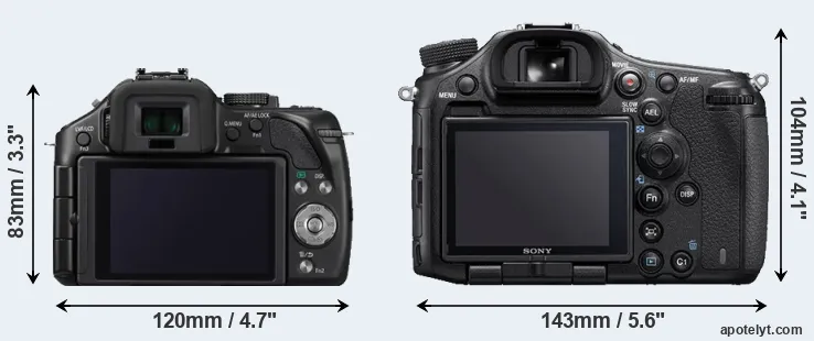 The physical size and weight of the Panasonic G5 and the Sony A99 II are illustrated in the side-by-side display below. The two cameras are presented according to their relative size. Three consecutive views from the front, the top, and the rear side are shown. All size dimensions are rounded to the nearest millimeter.