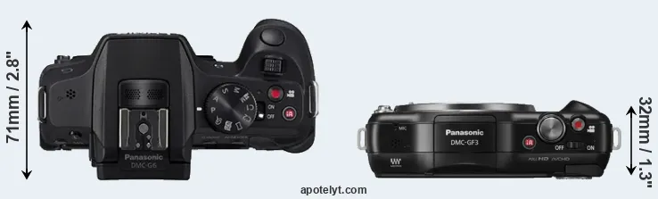 The physical size and weight of the Panasonic G6 and the Panasonic GF3 are illustrated in the side-by-side display below. The two cameras are presented according to their relative size. Three consecutive views from the front, the top, and the rear side are shown. All size dimensions are rounded to the nearest millimeter.