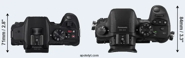 The side-by-side display below illustrates the physical size and weight of the Panasonic G6 and the Panasonic GH4. The two cameras are presented according to their relative size. Three successive views from the front, the top, and the rear are shown. All width, height and depth measures are rounded to the nearest millimeter.