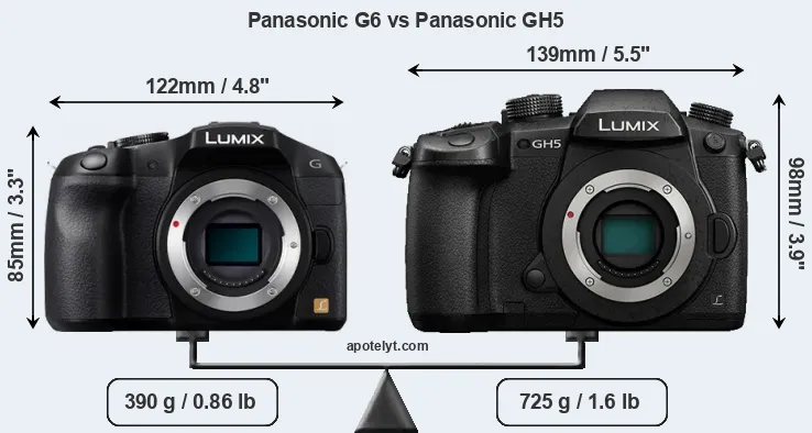 If the front view area (width x height) of the cameras is taken as an aggregate measure of their size, the Panasonic GH5 is notably larger (31 percent) than the Panasonic G6. Moreover, the GH5 is substantially heavier (86 percent) than the G6. It is noteworthy in this context that the GH5 is splash and dust-proof, while the G6 does not feature any corresponding weather-sealing.