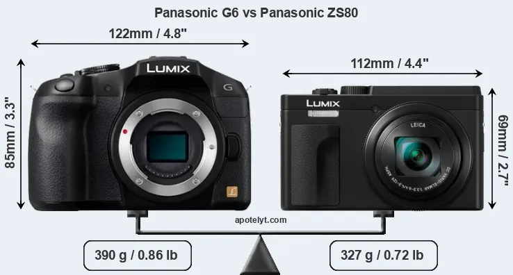 An illustration of the physical size and weight of the Panasonic G6 and the Panasonic ZS80 is provided in the side-by-side display below. The two cameras are presented according to their relative size. Three consecutive perspectives from the front, the top, and the back are available. All size dimensions are rounded to the nearest millimeter.