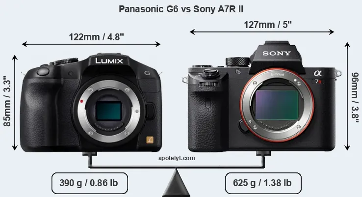If the front view area (width x height) of the cameras is taken as an aggregate measure of their size, the Sony A7R II is notably larger (18 percent) than the Panasonic G6. Moreover, the A7R II is substantially heavier (60 percent) than the G6. It is noteworthy in this context that the A7R II is splash and dust-proof, while the G6 does not feature any corresponding weather-sealing.