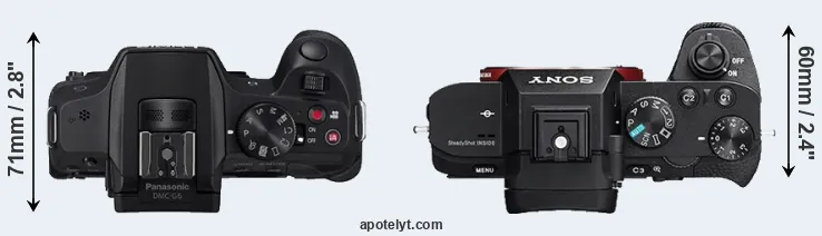 The side-by-side display below illustrates the physical size and weight of the Panasonic G6 and the Sony A7R II. The two cameras are presented according to their relative size. Three successive views from the front, the top, and the rear are shown. All size dimensions are rounded to the nearest millimeter.