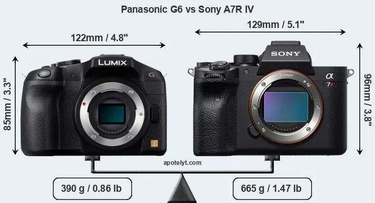 If the front view area (width x height) of the cameras is taken as an aggregate measure of their size, the Sony A7R IV is notably larger (19 percent) than the Panasonic G6. Moreover, the A7R IV is substantially heavier (71 percent) than the G6. It is noteworthy in this context that the A7R IV is splash and dust-proof, while the G6 does not feature any corresponding weather-sealing.