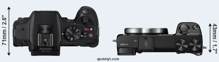 An illustration of the physical size and weight of the Panasonic G6 and the Sony NEX-7 is provided in the side-by-side display below. The two cameras are presented according to their relative size. Three consecutive perspectives from the front, the top, and the back are available. All width, height and depth measures are rounded to the nearest millimeter.