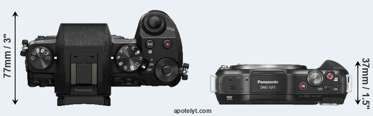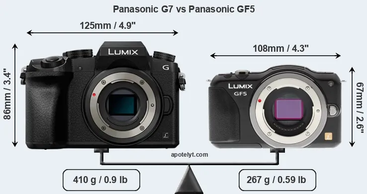 An illustration of the physical size and weight of the Panasonic G7 and the Panasonic GF5 is provided in the side-by-side display below. The two cameras are presented according to their relative size. Three successive views from the front, the top, and the rear are shown. All width, height and depth measures are rounded to the nearest millimeter.