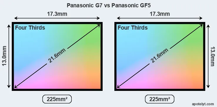 While the two cameras under review share the same sensor size, the G7 offers a higher resolution of 15.8 megapixels, compared with 12 MP of the GF5. This megapixels advantage translates into a 15 percent gain in linear resolution. On the other hand, these sensor specs imply that the G7 has a higher pixel density and a smaller size of the individual pixel (with a pixel pitch of 3.77μm versus 4.33μm for the GF5). In this context, it should be noted, however, that the G7 is much more recent (by 3 years and 1 month) than the GF5, and its sensor will have benefitted from technological advances during this time that compensate for the smaller pixel size.