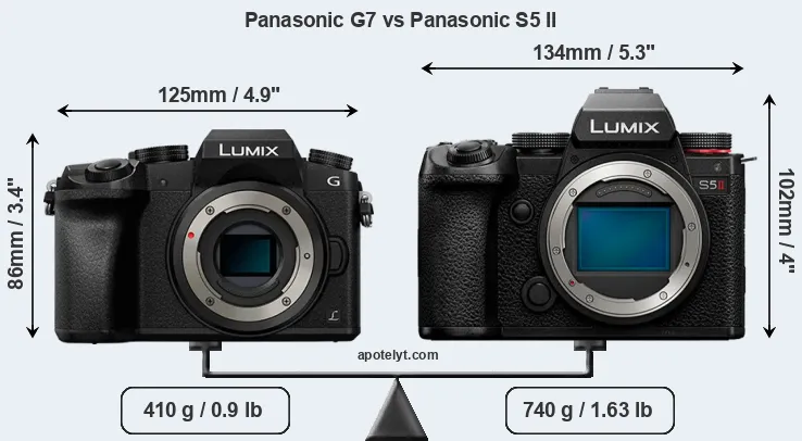 If the front view area (width x height) of the cameras is taken as an aggregate measure of their size, the Panasonic S5 II is notably larger (27 percent) than the Panasonic G7. Moreover, the S5 II is substantially heavier (80 percent) than the G7. It is noteworthy in this context that the S5 II is splash and dust-proof, while the G7 does not feature any corresponding weather-sealing.