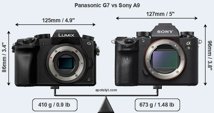 The side-by-side display below illustrates the physical size and weight of the Panasonic G7 and the Sony A9. The two cameras are presented according to their relative size. Three successive views from the front, the top, and the rear are shown. All width, height and depth dimensions are rounded to the nearest millimeter.