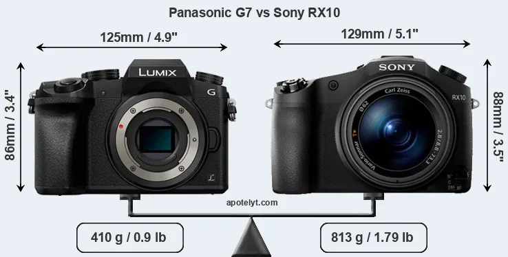 If the front view area (width x height) of the cameras is taken as an aggregate measure of their size, the Sony RX10 is notably larger (6 percent) than the Panasonic G7. It is noteworthy in this context that the RX10 is splash and dust-proof, while the G7 does not feature any corresponding weather-sealing.