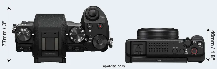 The side-by-side display below illustrates the physical size and weight of the Panasonic G7 and the Sony ZV-1F. The two cameras are presented according to their relative size. Three successive views from the front, the top, and the rear are shown. All size dimensions are rounded to the nearest millimeter.