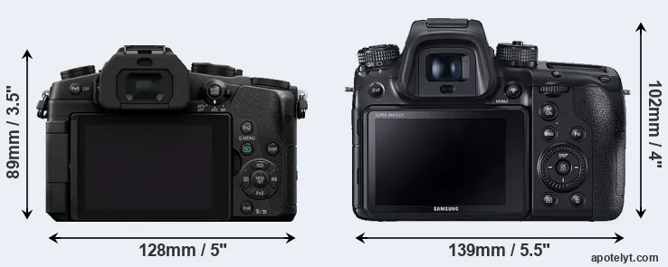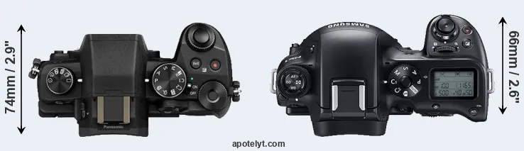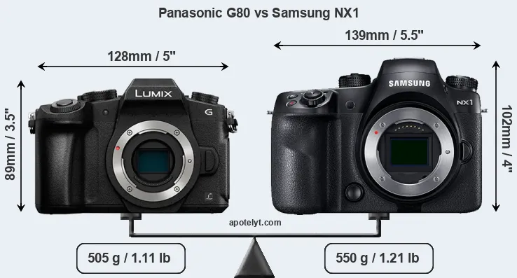 The side-by-side display below illustrates the physical size and weight of the Panasonic G80 and the Samsung NX1. The two cameras are presented according to their relative size. Three consecutive perspectives from the front, the top, and the back are available. All width, height and depth measures are rounded to the nearest millimeter.