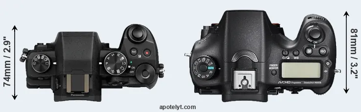 The physical size and weight of the Panasonic G80 and the Sony A77 II are illustrated in the side-by-side display below. The two cameras are presented according to their relative size. Three consecutive perspectives from the front, the top, and the back are available. All width, height and depth measures are rounded to the nearest millimeter.