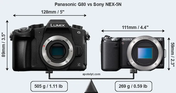 If the front view area (width x height) of the cameras is taken as an aggregate measure of their size, the Sony NEX-5N is considerably smaller (43 percent) than the Panasonic G80. Moreover, the NEX-5N is substantially lighter (47 percent) than the G80. It is worth mentioning in this context that the G80 is splash and dust resistant, while the NEX-5N does not feature any corresponding weather-sealing.
