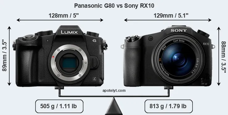 If the front view area (width x height) of the cameras is taken as an aggregate measure of their size, the Panasonic G80 and the Sony RX10 are of equal size. In this context, it is worth noting that both cameras are splash and dust-proof and can, hence, be used in inclement weather conditions or harsh environments.