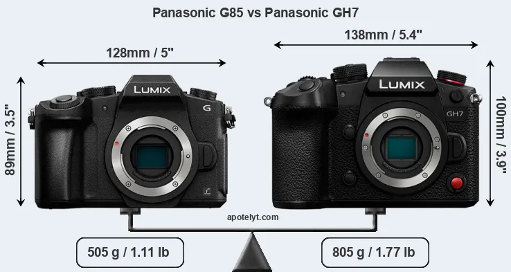 The side-by-side display below illustrates the physical size and weight of the Panasonic G85 and the Panasonic GH7. The two cameras are presented according to their relative size. Three consecutive perspectives from the front, the top, and the back are available. All width, height and depth dimensions are rounded to the nearest millimeter.