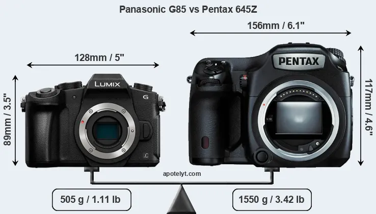 An illustration of the physical size and weight of the Panasonic G85 and the Pentax 645Z is provided in the side-by-side display below. The two cameras are presented according to their relative size. Three successive views from the front, the top, and the rear are shown. All width, height and depth dimensions are rounded to the nearest millimeter.