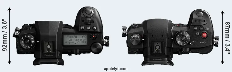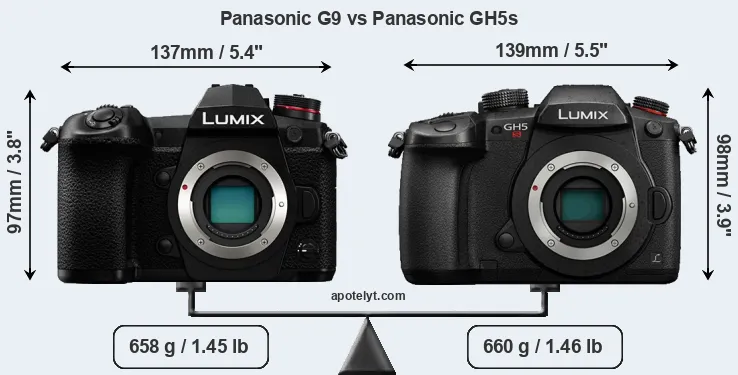 The physical size and weight of the Panasonic G9 and the Panasonic GH5s are illustrated in the side-by-side display below. The two cameras are presented according to their relative size. Three successive views from the front, the top, and the rear are shown. All width, height and depth dimensions are rounded to the nearest millimeter.