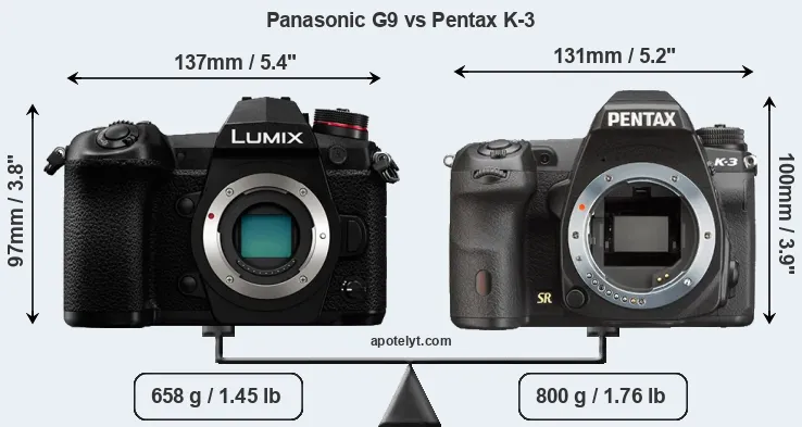 The side-by-side display below illustrates the physical size and weight of the Panasonic G9 and the Pentax K-3. The two cameras are presented according to their relative size. Three consecutive perspectives from the front, the top, and the back are available. All width, height and depth measures are rounded to the nearest millimeter.