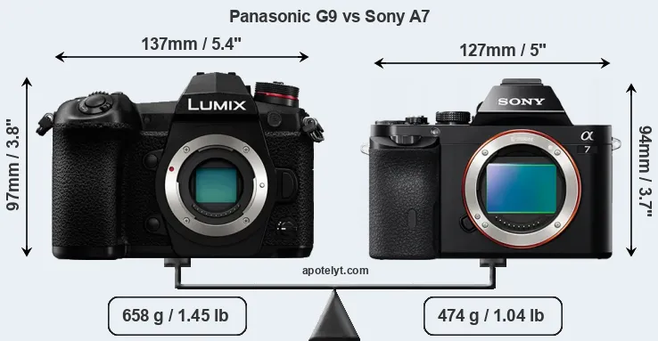 An illustration of the physical size and weight of the Panasonic G9 and the Sony A7 is provided in the side-by-side display below. The two cameras are presented according to their relative size. Three successive views from the front, the top, and the rear are shown. All width, height and depth measures are rounded to the nearest millimeter.