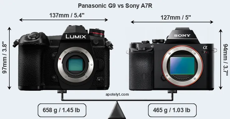 An illustration of the physical size and weight of the Panasonic G9 and the Sony A7R is provided in the side-by-side display below. The two cameras are presented according to their relative size. Three consecutive views from the front, the top, and the rear side are shown. All width, height and depth measures are rounded to the nearest millimeter.