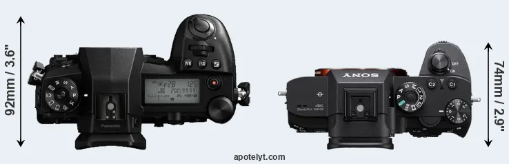 The physical size and weight of the Panasonic G9 and the Sony A7R III are illustrated in the side-by-side display below. The two cameras are presented according to their relative size. Three consecutive views from the front, the top, and the rear side are shown. All size dimensions are rounded to the nearest millimeter.