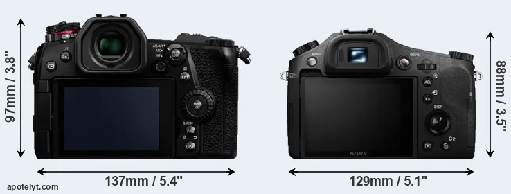 The physical size and weight of the Panasonic G9 and the Sony RX10 II are illustrated in the side-by-side display below. The two cameras are presented according to their relative size. Three successive views from the front, the top, and the rear are shown. All width, height and depth dimensions are rounded to the nearest millimeter.