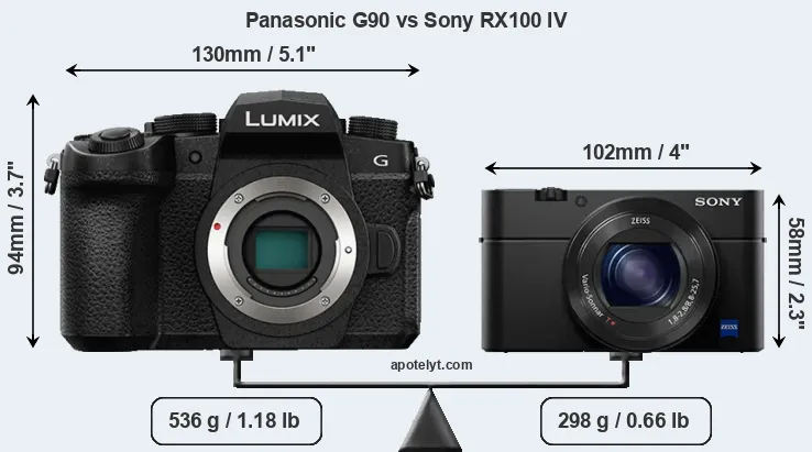 The physical size and weight of the Panasonic G90 and the Sony RX100 IV are illustrated in the side-by-side display below. The two cameras are presented according to their relative size. Three consecutive perspectives from the front, the top, and the back are available. All width, height and depth measures are rounded to the nearest millimeter.