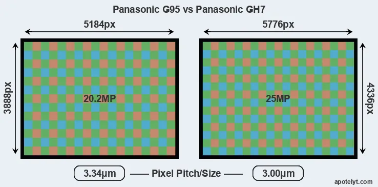 While the two cameras under review share the same sensor size, the GH7 offers a higher resolution of 25 megapixels, compared with 20.2 MP of the G95. This megapixels advantage translates into a 11 percent gain in linear resolution. On the other hand, these sensor specs imply that the GH7 has a higher pixel density and a smaller size of the individual pixel (with a pixel pitch of 3.00μm versus 3.34μm for the G95). However, it should be noted that the GH7 is much more recent (by 5 years and 2 months) than the G95, and its sensor will have benefitted from technological advances during this time that compensate for the smaller pixel size. Coming back to sensor resolution, it should be mentioned that neither of the two cameras has an anti-alias filter installed, so they are able to capture all the detail the sensor resolves.