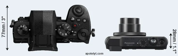 The physical size and weight of the Panasonic G95 and the Panasonic LF1 are illustrated in the side-by-side display below. The two cameras are presented according to their relative size. Three consecutive views from the front, the top, and the rear side are shown. All size dimensions are rounded to the nearest millimeter.