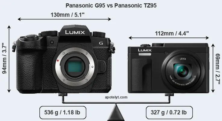 An illustration of the physical size and weight of the Panasonic G95 and the Panasonic TZ95 is provided in the side-by-side display below. The two cameras are presented according to their relative size. Three consecutive perspectives from the front, the top, and the back are available. All width, height and depth dimensions are rounded to the nearest millimeter.