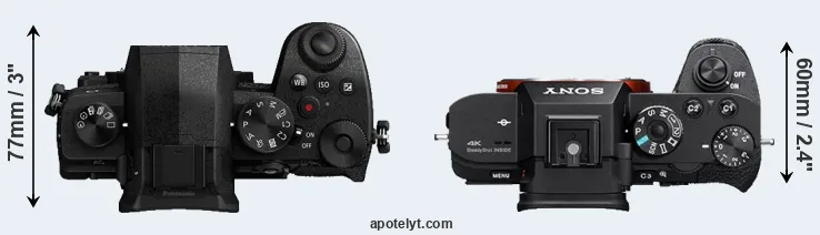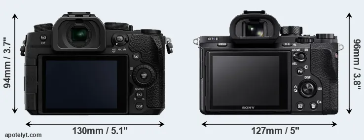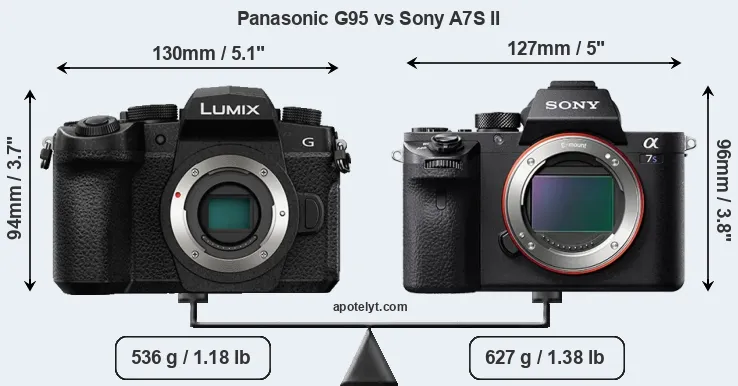 The side-by-side display below illustrates the physical size and weight of the Panasonic G95 and the Sony A7S II. The two cameras are presented according to their relative size. Three consecutive perspectives from the front, the top, and the back are available. All width, height and depth measures are rounded to the nearest millimeter.