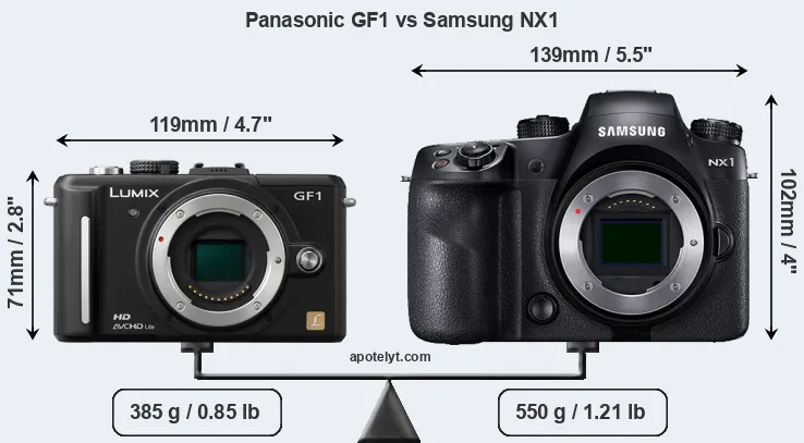 If the front view area (width x height) of the cameras is taken as an aggregate measure of their size, the Samsung NX1 is considerably larger (68 percent) than the Panasonic GF1. Moreover, the NX1 is substantially heavier (43 percent) than the GF1. It is noteworthy in this context that the NX1 is splash and dust-proof, while the GF1 does not feature any corresponding weather-sealing.