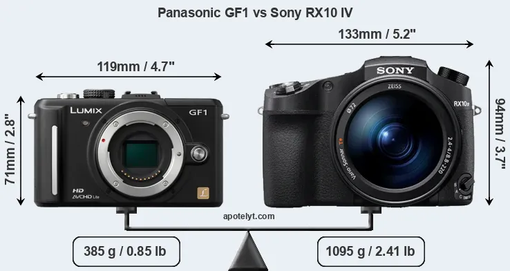If the front view area (width x height) of the cameras is taken as an aggregate measure of their size, the Sony RX10 IV is considerably larger (48 percent) than the Panasonic GF1. It is noteworthy in this context that the RX10 IV is splash and dust-proof, while the GF1 does not feature any corresponding weather-sealing.