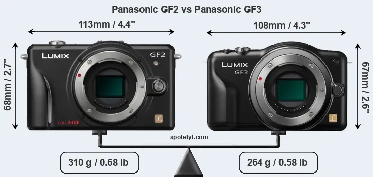 An illustration of the physical size and weight of the Panasonic GF2 and the Panasonic GF3 is provided in the side-by-side display below. The two cameras are presented according to their relative size. Three successive views from the front, the top, and the rear are shown. All width, height and depth measures are rounded to the nearest millimeter.
