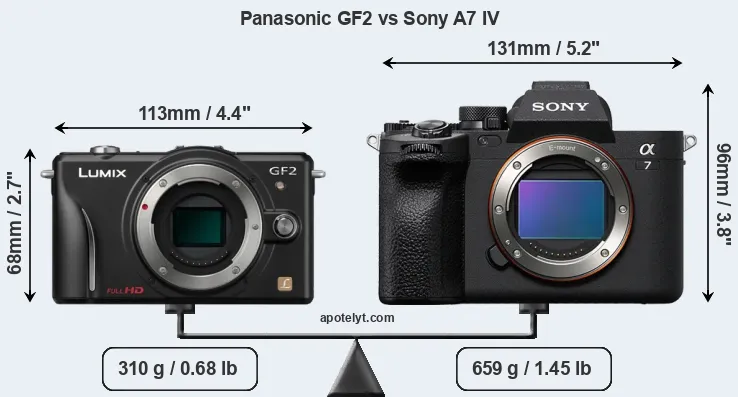 If the front view area (width x height) of the cameras is taken as an aggregate measure of their size, the Sony A7 IV is considerably larger (64 percent) than the Panasonic GF2. Moreover, the A7 IV is substantially heavier (113 percent) than the GF2. It is noteworthy in this context that the A7 IV is splash and dust-proof, while the GF2 does not feature any corresponding weather-sealing.