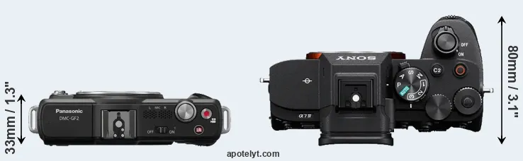The side-by-side display below illustrates the physical size and weight of the Panasonic GF2 and the Sony A7 IV. The two cameras are presented according to their relative size. Three successive views from the front, the top, and the rear are shown. All width, height and depth dimensions are rounded to the nearest millimeter.