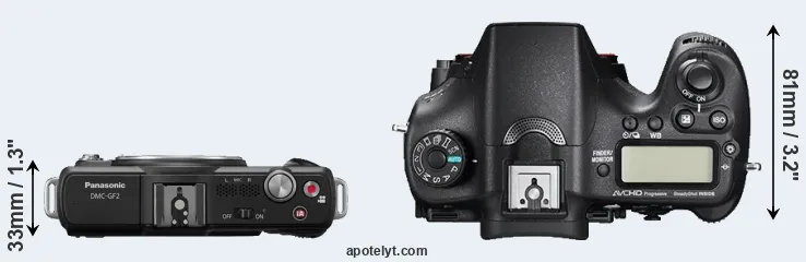 An illustration of the physical size and weight of the Panasonic GF2 and the Sony A77 II is provided in the side-by-side display below. The two cameras are presented according to their relative size. Three consecutive views from the front, the top, and the rear side are shown. All width, height and depth measures are rounded to the nearest millimeter.