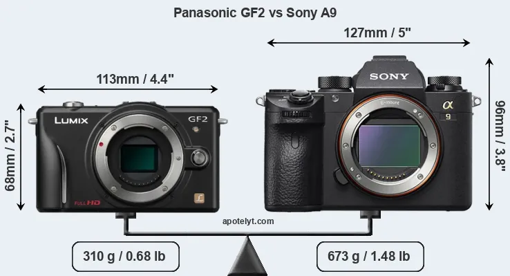 If the front view area (width x height) of the cameras is taken as an aggregate measure of their size, the Sony A9 is considerably larger (59 percent) than the Panasonic GF2. Moreover, the A9 is substantially heavier (117 percent) than the GF2. It is noteworthy in this context that the A9 is splash and dust-proof, while the GF2 does not feature any corresponding weather-sealing.