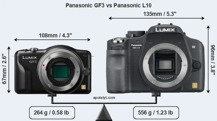 An illustration of the physical size and weight of the Panasonic GF3 and the Panasonic L10 is provided in the side-by-side display below. The two cameras are presented according to their relative size. Three successive views from the front, the top, and the rear are shown. All size dimensions are rounded to the nearest millimeter.