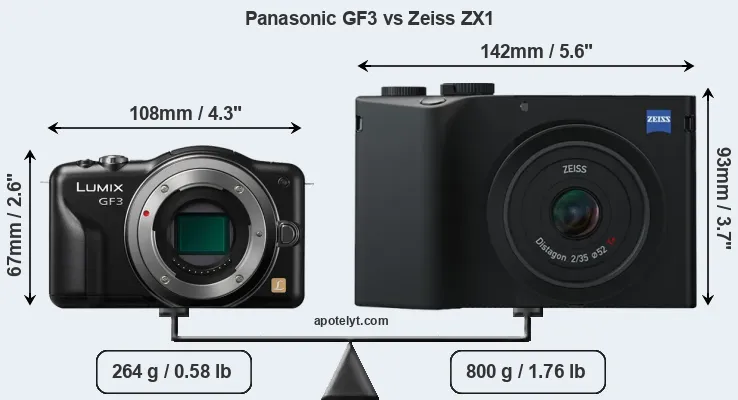 If the front view area (width x height) of the cameras is taken as an aggregate measure of their size, the Zeiss ZX1 is considerably larger (83 percent) than the Panasonic GF3. In this context, it is worth noting that neither the GF3 nor the ZX1 are weather-sealed.