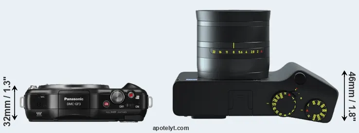 An illustration of the physical size and weight of the Panasonic GF3 and the Zeiss ZX1 is provided in the side-by-side display below. The two cameras are presented according to their relative size. Three consecutive views from the front, the top, and the rear side are shown. All width, height and depth measures are rounded to the nearest millimeter.