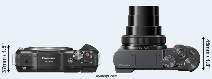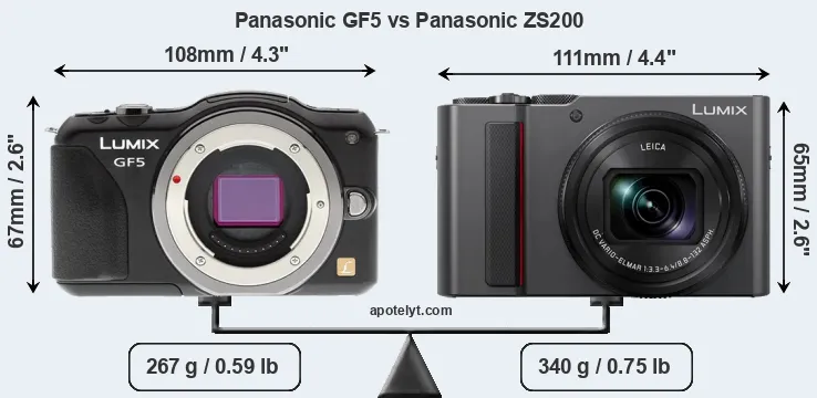 The side-by-side display below illustrates the physical size and weight of the Panasonic GF5 and the Panasonic ZS200. The two cameras are presented according to their relative size. Three consecutive perspectives from the front, the top, and the back are available. All width, height and depth measures are rounded to the nearest millimeter.