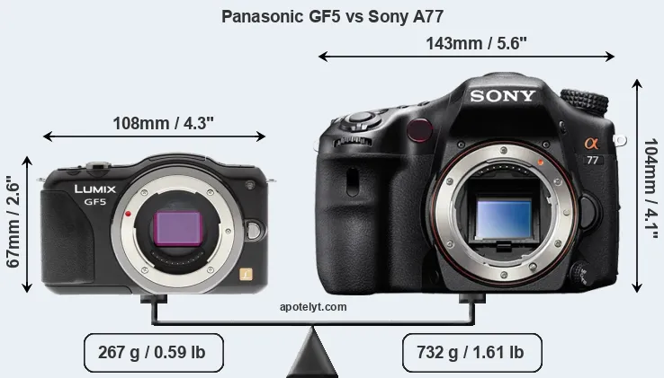 If the front view area (width x height) of the cameras is taken as an aggregate measure of their size, the Sony A77 is considerably larger (106 percent) than the Panasonic GF5. Moreover, the A77 is substantially heavier (174 percent) than the GF5. It is noteworthy in this context that the A77 is splash and dust-proof, while the GF5 does not feature any corresponding weather-sealing.