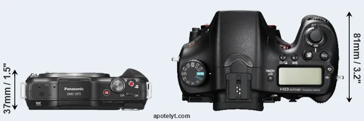 The physical size and weight of the Panasonic GF5 and the Sony A77 are illustrated in the side-by-side display below. The two cameras are presented according to their relative size. Three consecutive views from the front, the top, and the rear side are shown. All width, height and depth dimensions are rounded to the nearest millimeter.