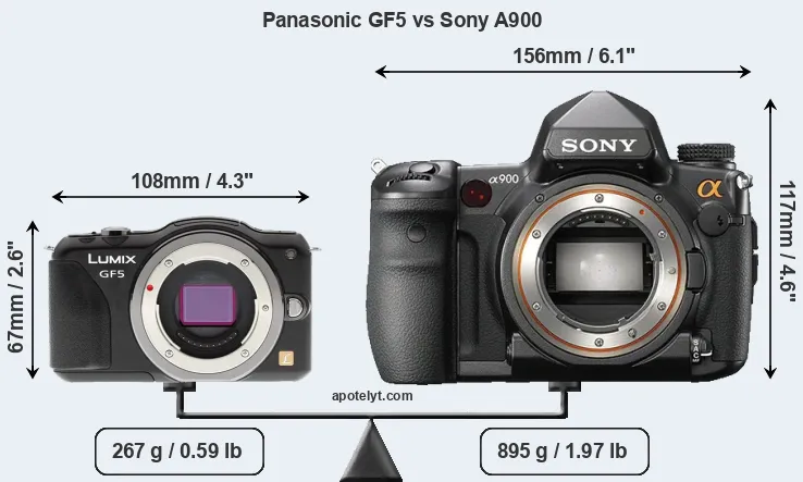 If the front view area (width x height) of the cameras is taken as an aggregate measure of their size, the Sony A900 is considerably larger (152 percent) than the Panasonic GF5. Moreover, the A900 is substantially heavier (235 percent) than the GF5. It is noteworthy in this context that the A900 is splash and dust-proof, while the GF5 does not feature any corresponding weather-sealing.