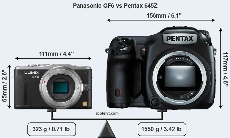 If the front view area (width x height) of the cameras is taken as an aggregate measure of their size, the Pentax 645Z is considerably larger (153 percent) than the Panasonic GF6. Moreover, the 645Z is substantially heavier (380 percent) than the GF6. It is noteworthy in this context that the 645Z is splash and dust-proof, while the GF6 does not feature any corresponding weather-sealing.
