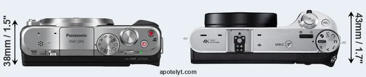 The physical size and weight of the Panasonic GF6 and the Samsung NX500 are illustrated in the side-by-side display below. The two cameras are presented according to their relative size. Three successive views from the front, the top, and the rear are shown. All width, height and depth dimensions are rounded to the nearest millimeter.