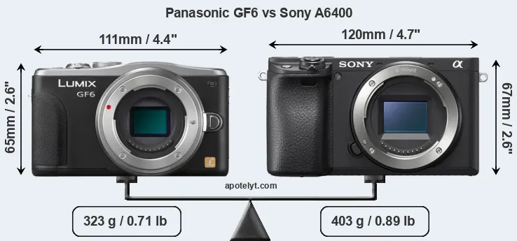 If the front view area (width x height) of the cameras is taken as an aggregate measure of their size, the Sony A6400 is notably larger (11 percent) than the Panasonic GF6. Moreover, the A6400 is markedly heavier (25 percent) than the GF6. It is noteworthy in this context that the A6400 is splash and dust-proof, while the GF6 does not feature any corresponding weather-sealing.