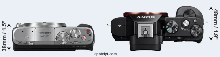 If the front view area (width x height) of the cameras is taken as an aggregate measure of their size, the Sony A7 is considerably larger (65 percent) than the Panasonic GF6. Moreover, the A7 is substantially heavier (47 percent) than the GF6. It is noteworthy in this context that the A7 is splash and dust-proof, while the GF6 does not feature any corresponding weather-sealing.